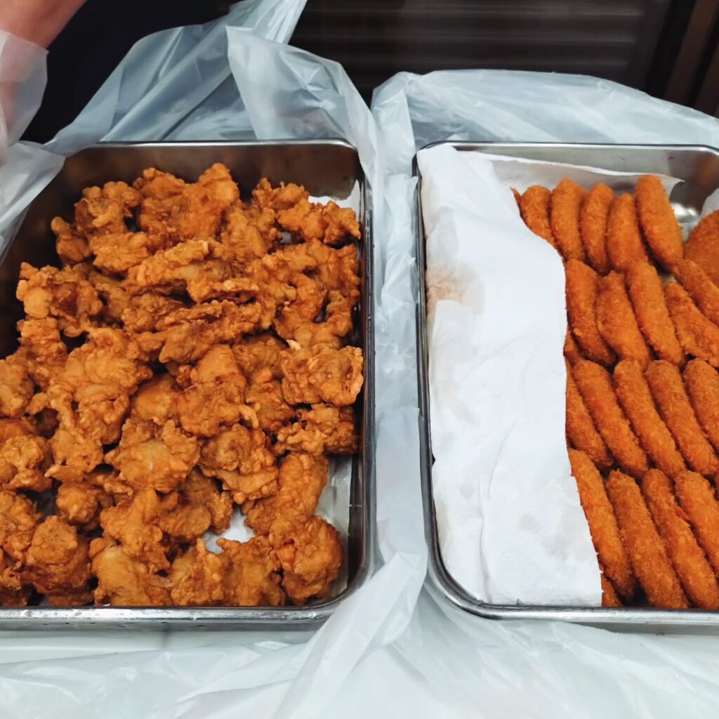 🥪 昼食はサンドウィッチ、唐揚げ、コロッケにオレンジジュース。