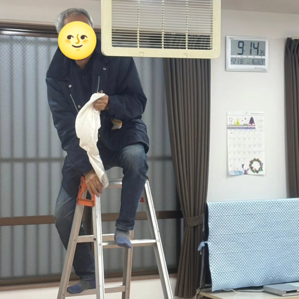地域の会館をいつも利用している各種団体が、皆さんで協力して大掃除をしました。本館には17名、別館には12名の方々が集まってくださり、日頃なかなか手が届かない空調機器や網戸等を、丁寧に洗ったり拭き掃除したり…。