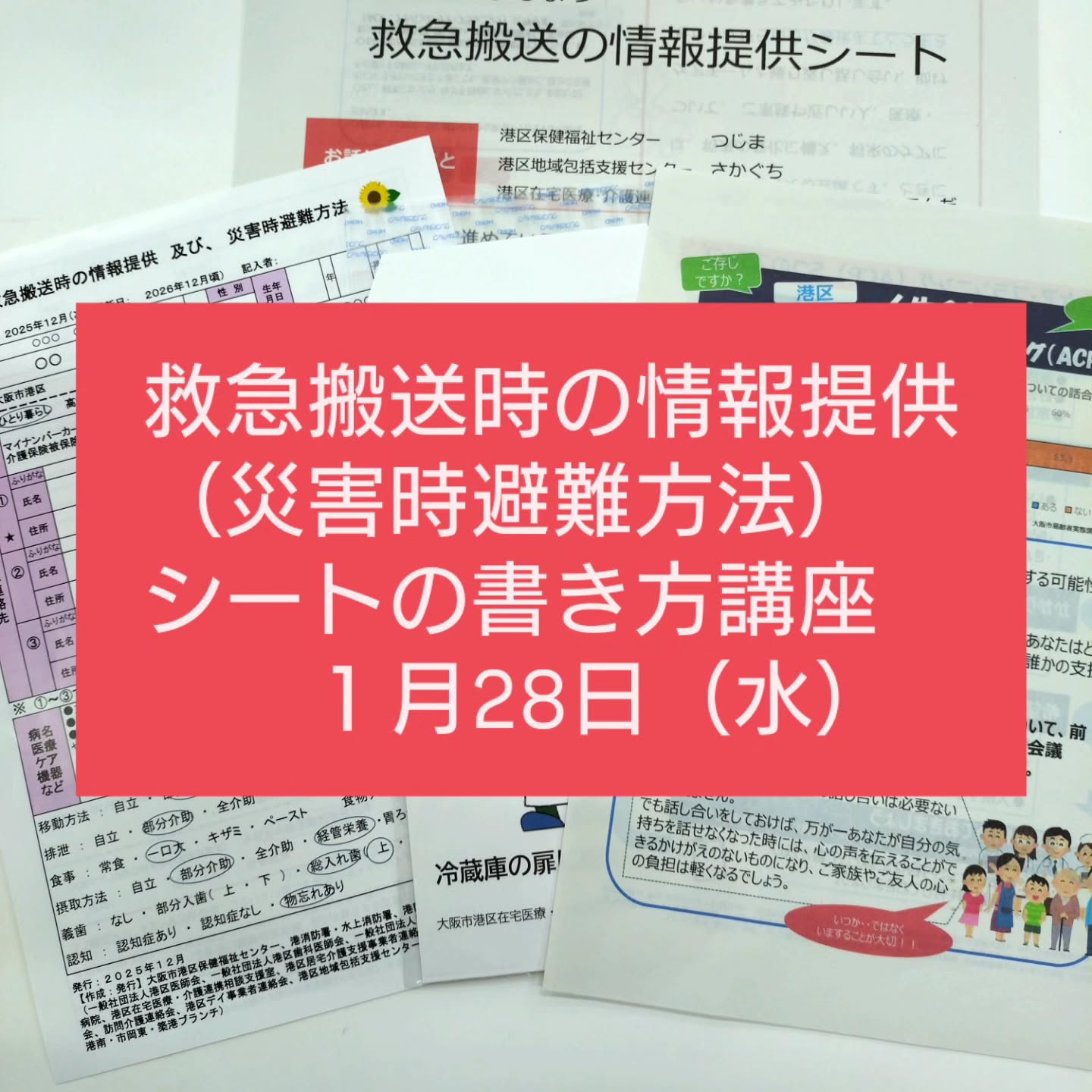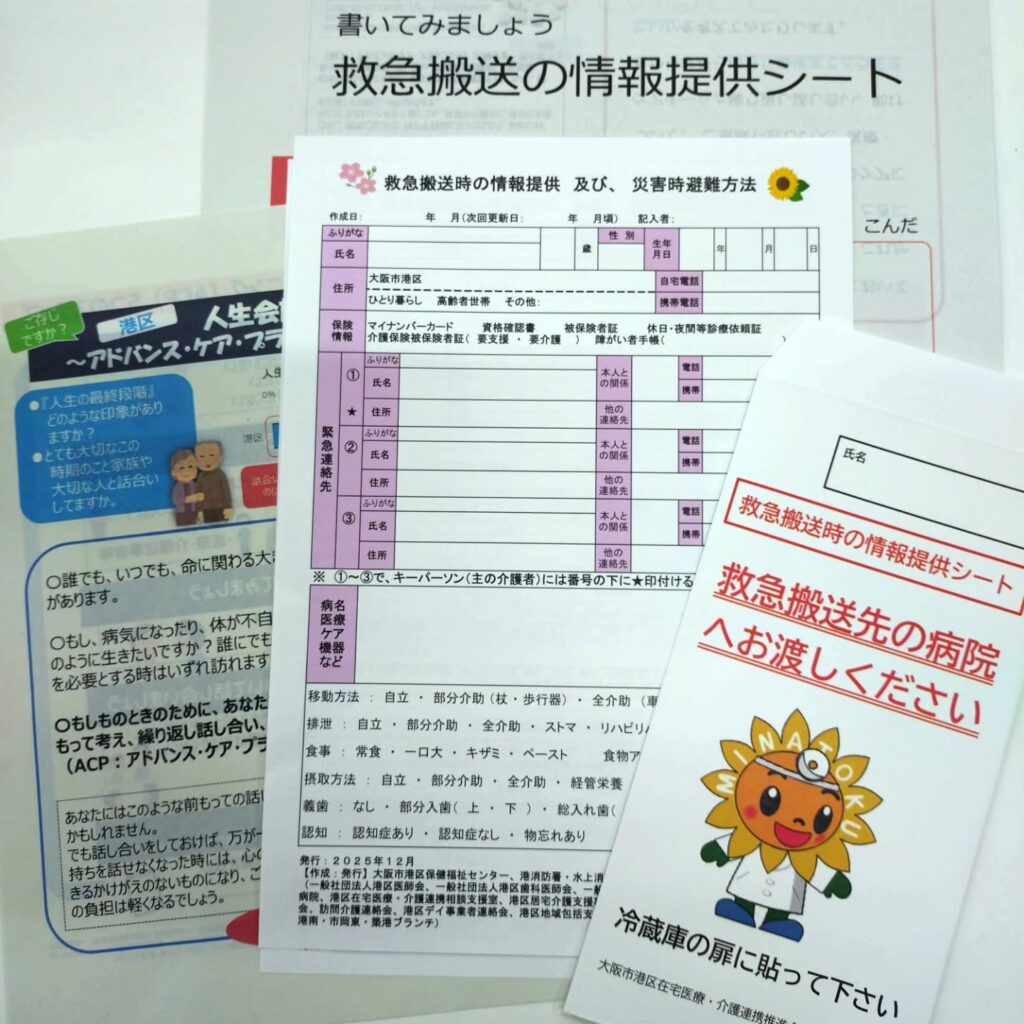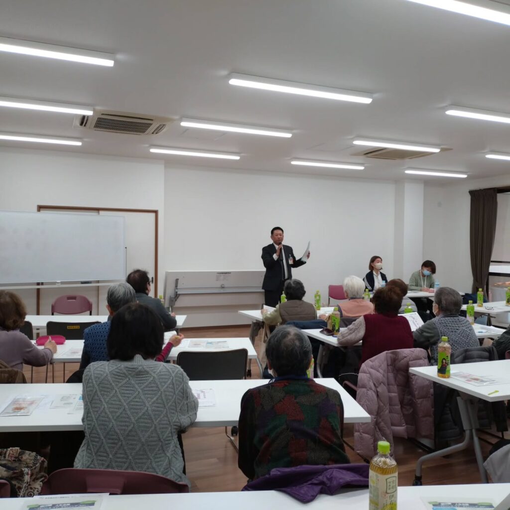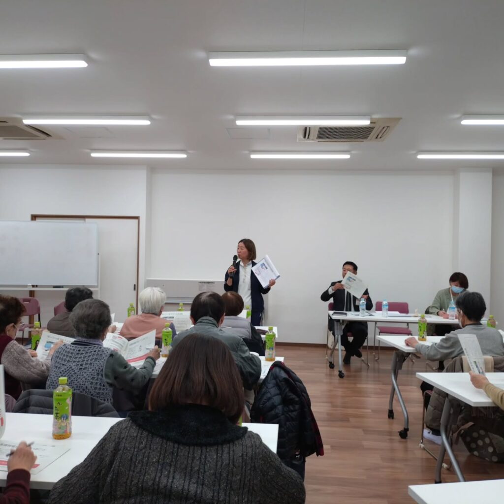 「救急搬送時(災害時避難方法)の情報提供シート」の書き方講座を開催しました。保健福祉センターから辻間さん、在宅医療.介護連携相談支援室の紺田さん、地域包括支援センターの高村さんにお越しいただき、人生会議(ACP)のお話や、シート作成の背景などを伺いながら、実際にシートに記入してみました。百歳体操のメンバーを中心に32名の参加いただきました。作成したシートは、冷蔵庫などの見えるところに貼りつけて保管。いざという時に役立つ備えとして、地域の皆さんに、これから広めて行くことになります。