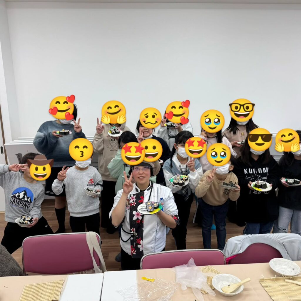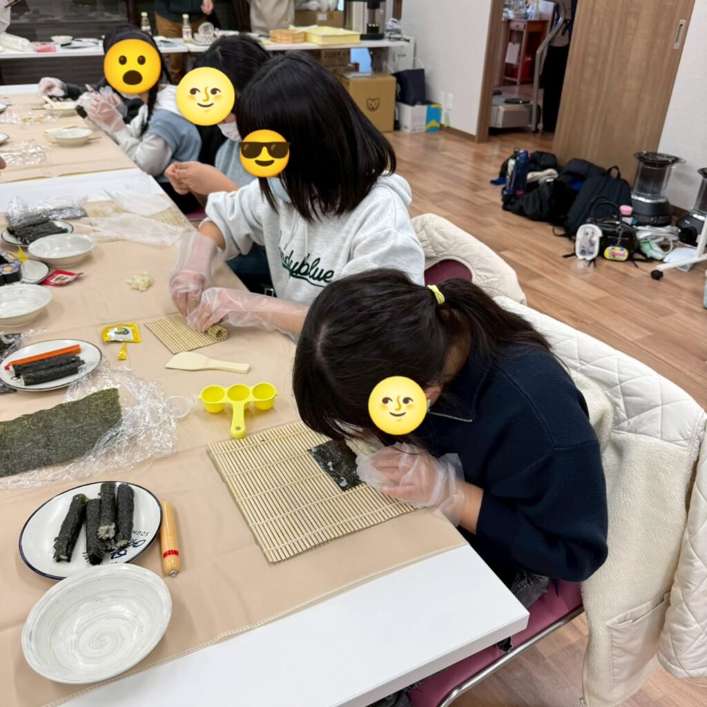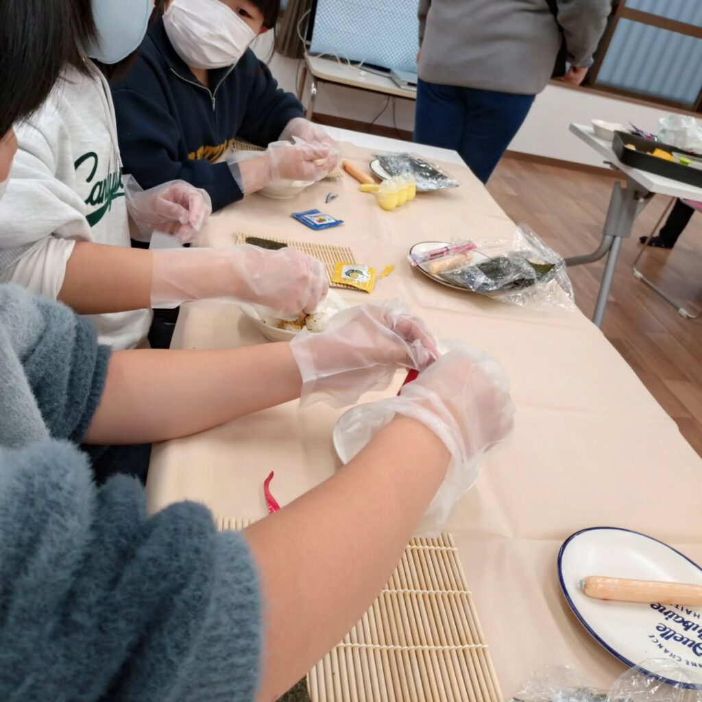 節分前にこどもたちは巻き寿司作りに挑戦。調理用手袋とマスクをつけて衛生面に気を配りつつ、細く巻くのに苦戦しながらも、見事に花飾りの巻き寿司が完成。「南南東を向いて食べよう」の合図に自分で作った巻き寿司をほおばり、笑顔が広がります。