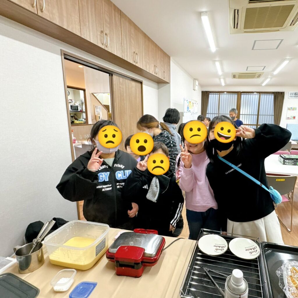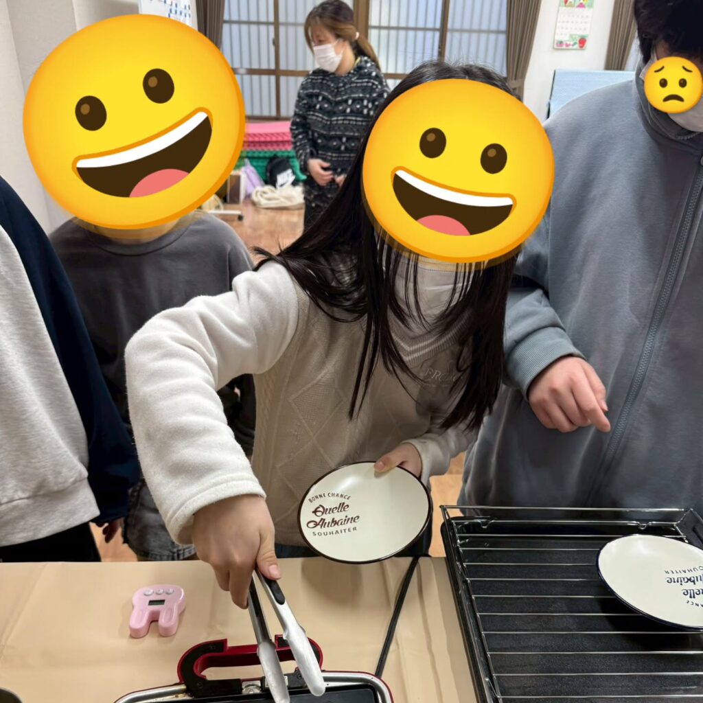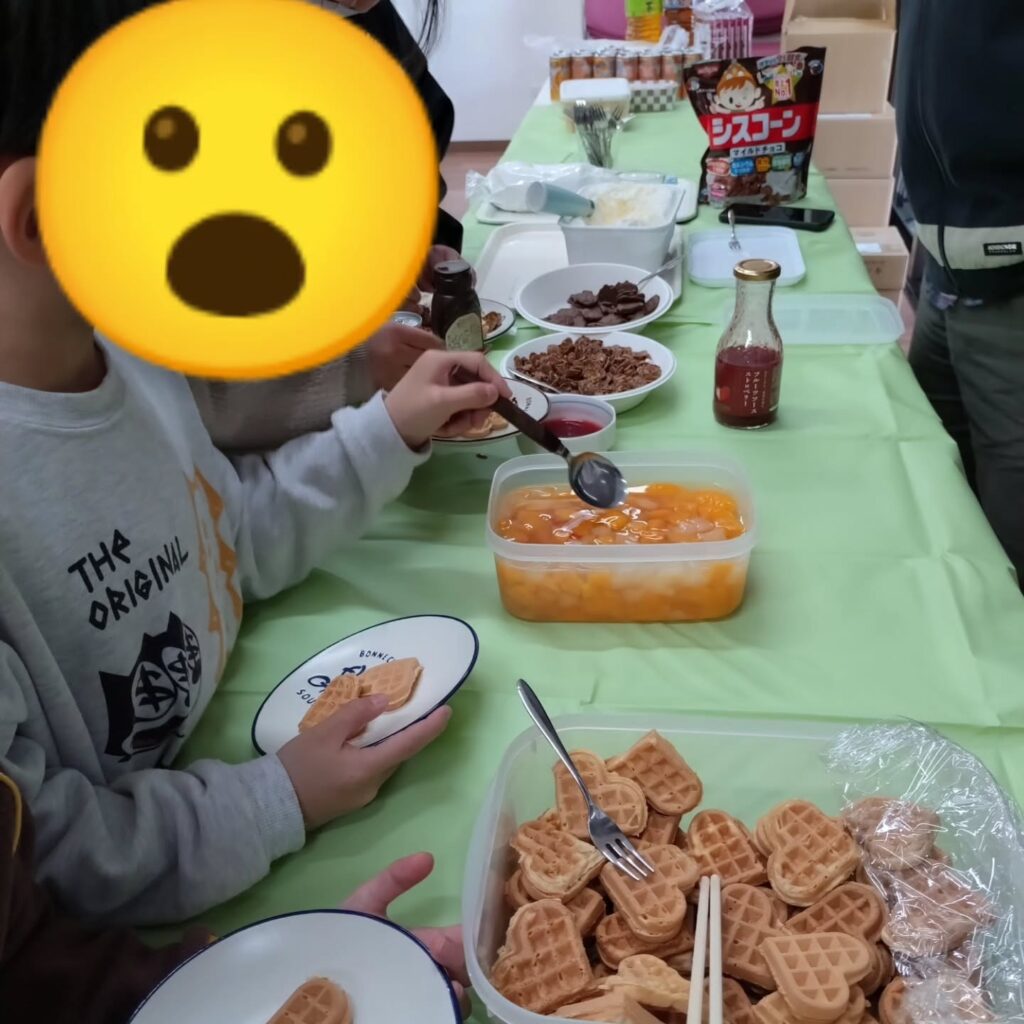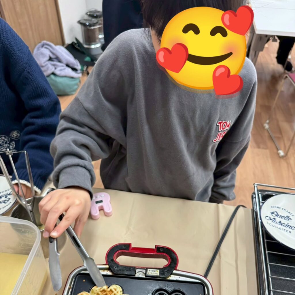 今日のクッキングはワッフルづくり。フルーツやホイップ、アイス、クッキーを自由に飾りつけ、どれも個性あふれる“ひとつだけ”のワッフルが完成しました。調理している時間も笑顔がいっぱいで、子どもたちの発想力にこちらまでワクワク…🍓
