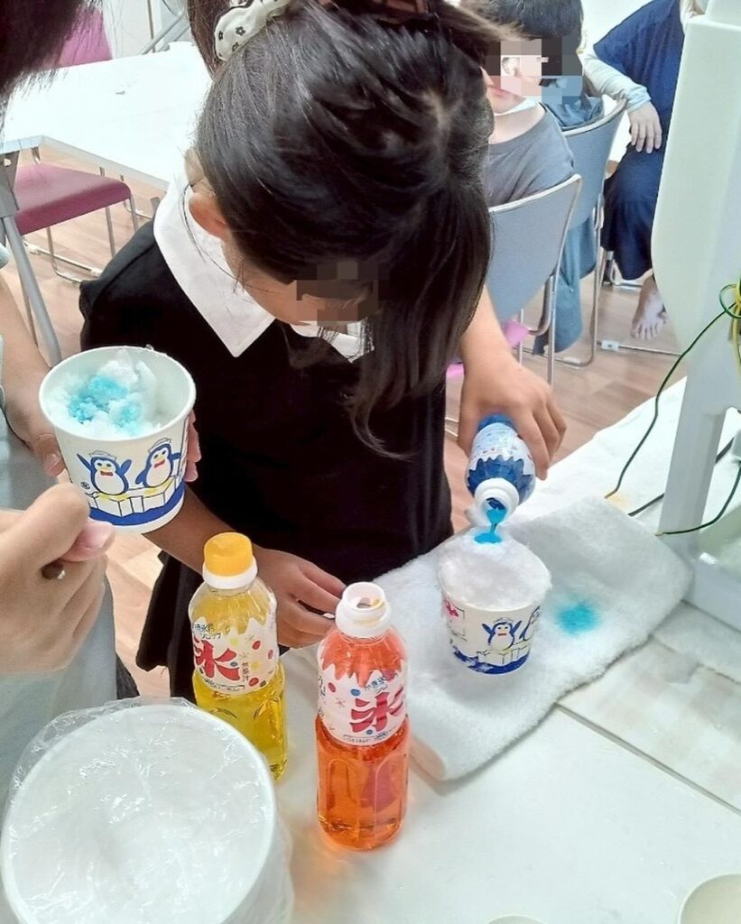 そして、三社神社夏祭りから5日後ということもあり、冷凍室にあった純氷をいただけるとのこと、38℃超えの日に涼を得るという恩恵を受けることが出来ました。急きょ登場したかき氷✨好きなだけシロップかけてもOKな、かき氷タイムに子どもたちもスタッフも大興奮でした(*ˊ˘ˋ*)